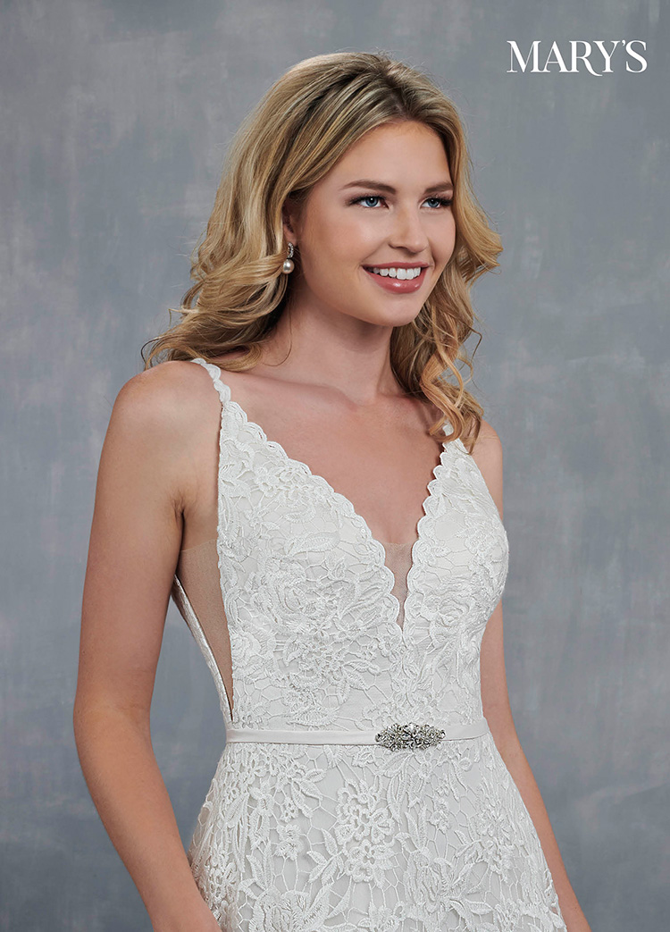Fantastic guipure lace A-line wedding/bridal dress with a deep V-shaped neckline, thin straps and side bodice illusion insets. The gown features a thin natural waistband and a chapel length train.